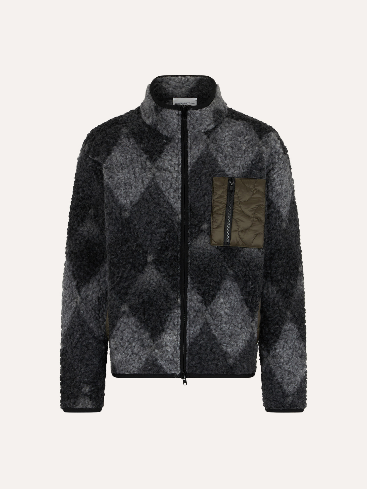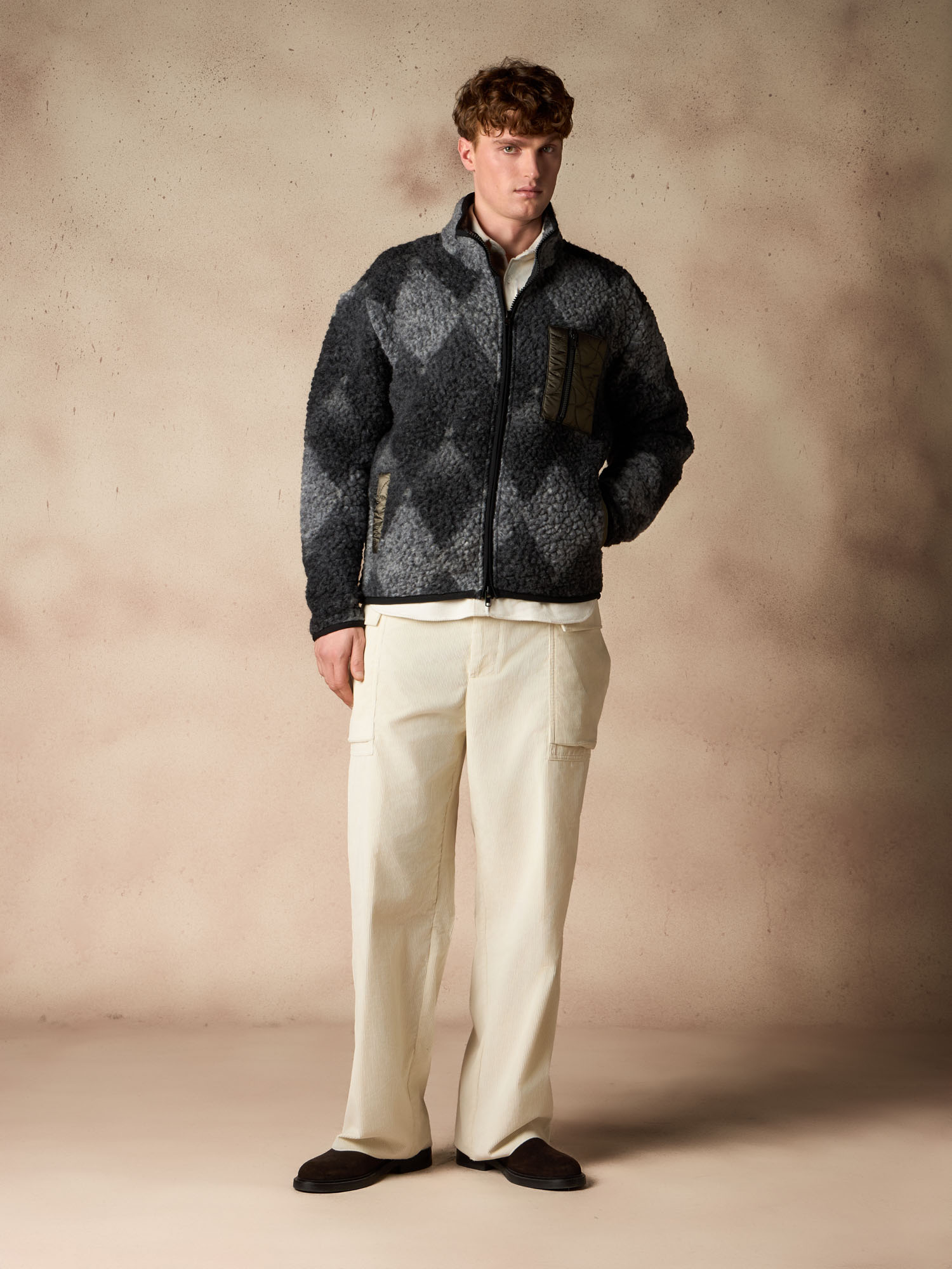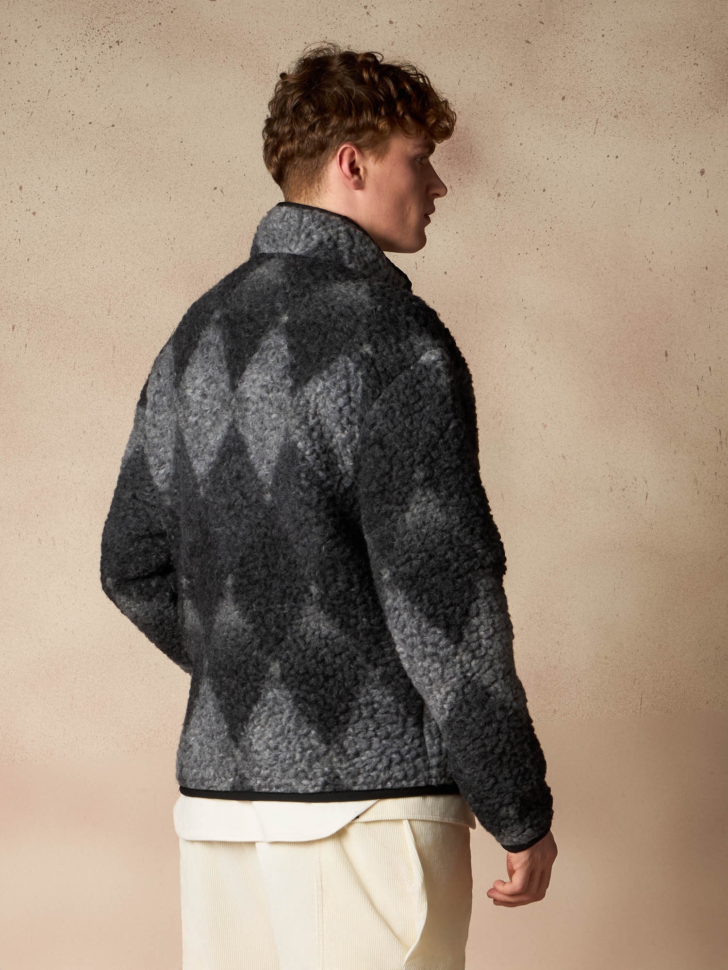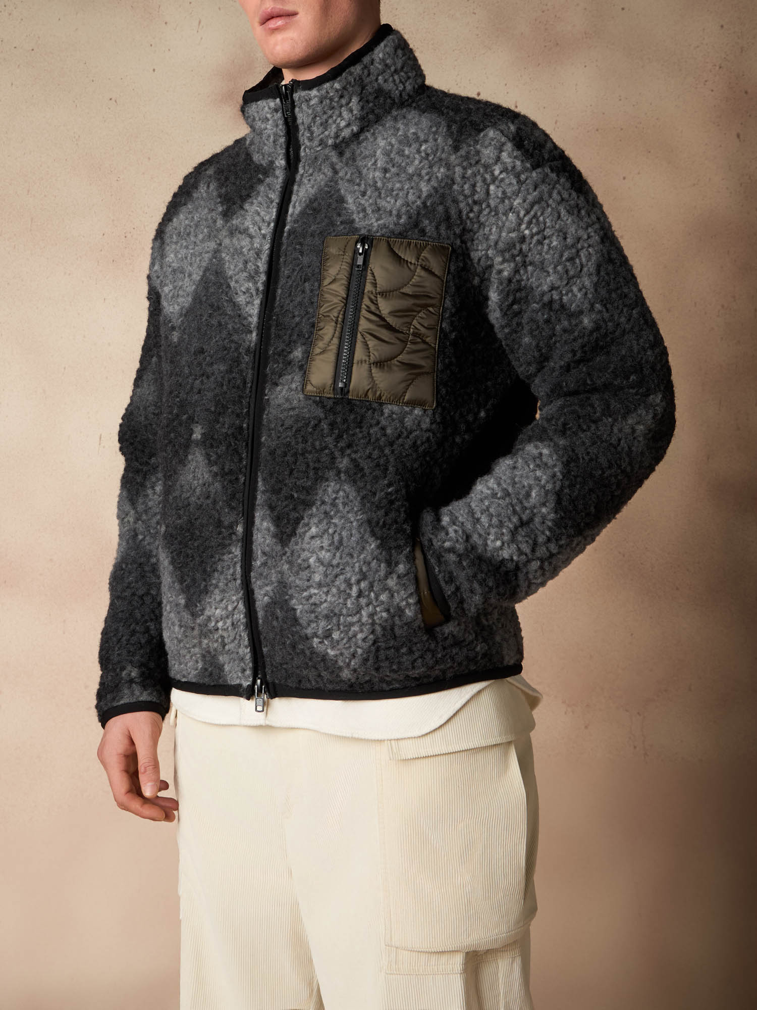 Design grafico e spirito contemporaneo si incontrano in questa giacca in pile con iconico motivo a rombi. Il tessuto effetto orsetto dona volume e texture al capo, mentre il contrasto con la tasca applicata in nylon tecnico imbottito aggiunge un tocco funzionale e moderno. Il collo alto e la zip frontale completano una silhouette pratica ma distintiva, pensata per accompagnare la stagione fredda con comfort e stile. Un outerwear urbano e versatile, ideale per valorizzare ogni look quotidiano con carattere.