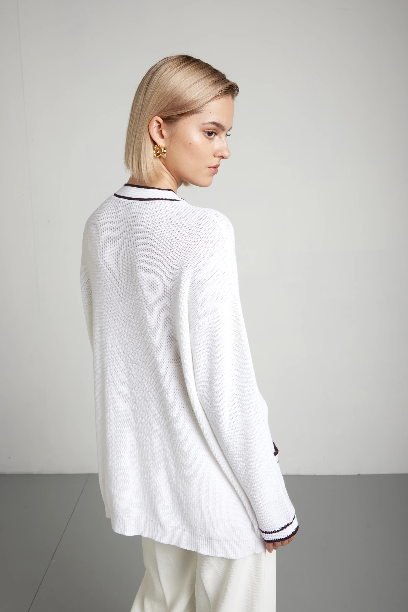 Cardigan dispirazione tennis, con bottoni, caratterizzato da bordi a contrasto che valorizzano il collo, i polsi e le tasche. La lavorazione in costa inglese conferisce struttura, tridimensionalità e una vestibilità stabile nel tempo, mantenendo al contempo morbidezza e comfort.Il design richiama lestetica sportiva heritage, reinterpretata in chiave contemporanea: pulita, grafica, riconoscibile. Ideale da indossare sopra una t-shirt o una camicia per un look casual curato. Un capo iconico che unisce tradizione manifatturiera e stile senza tempo.