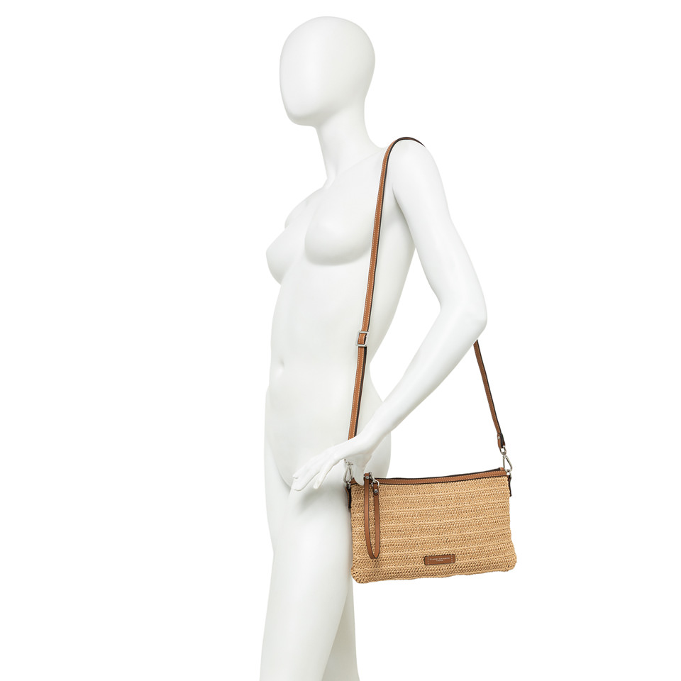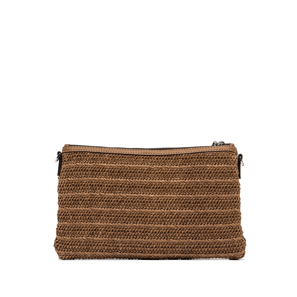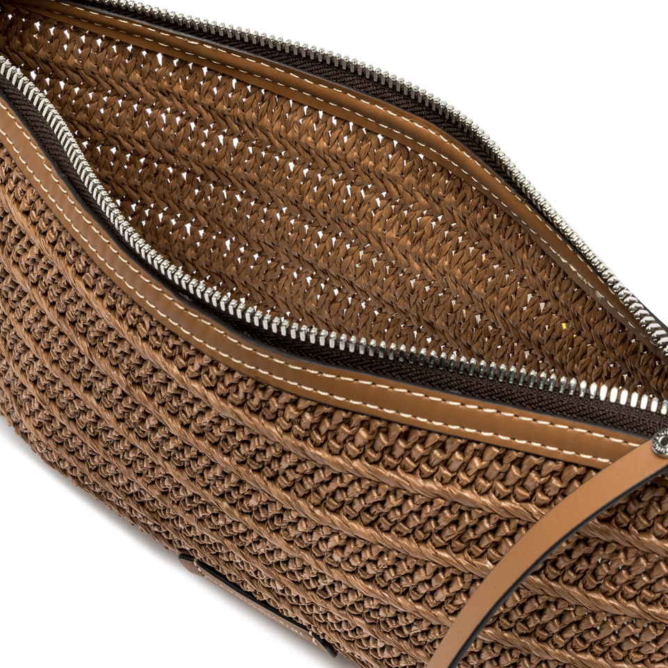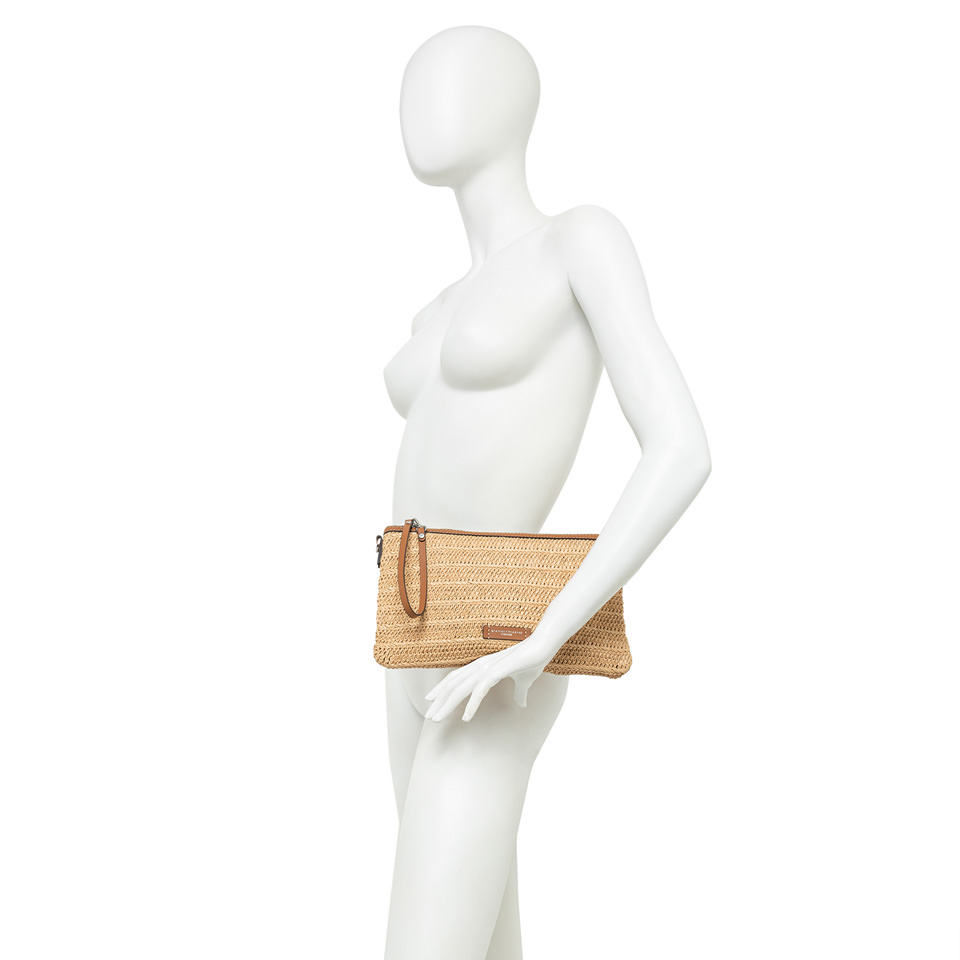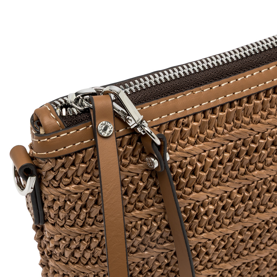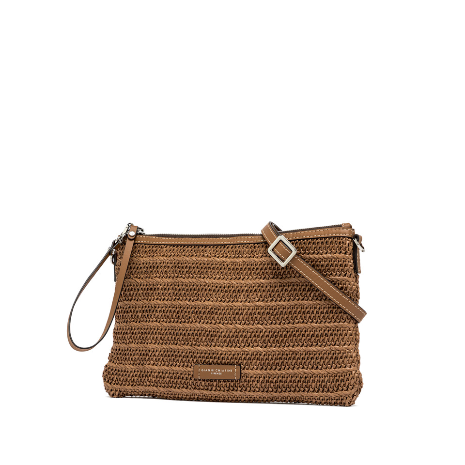 La nuova pochette Marcella by Gianni Chiarini Firenze è realizzata in paglia effetto stuoia per unestetica leggera e naturale. I profili in pelle ne esaltano lo stile rustico chic, mentre la chiusura con zip e il tirazip in pelle permettono di indossarla comodamente al polso. Dotata di una sottile tracolla in tono, è laccessorio ideale da portare con sé dal giorno alla sera.
