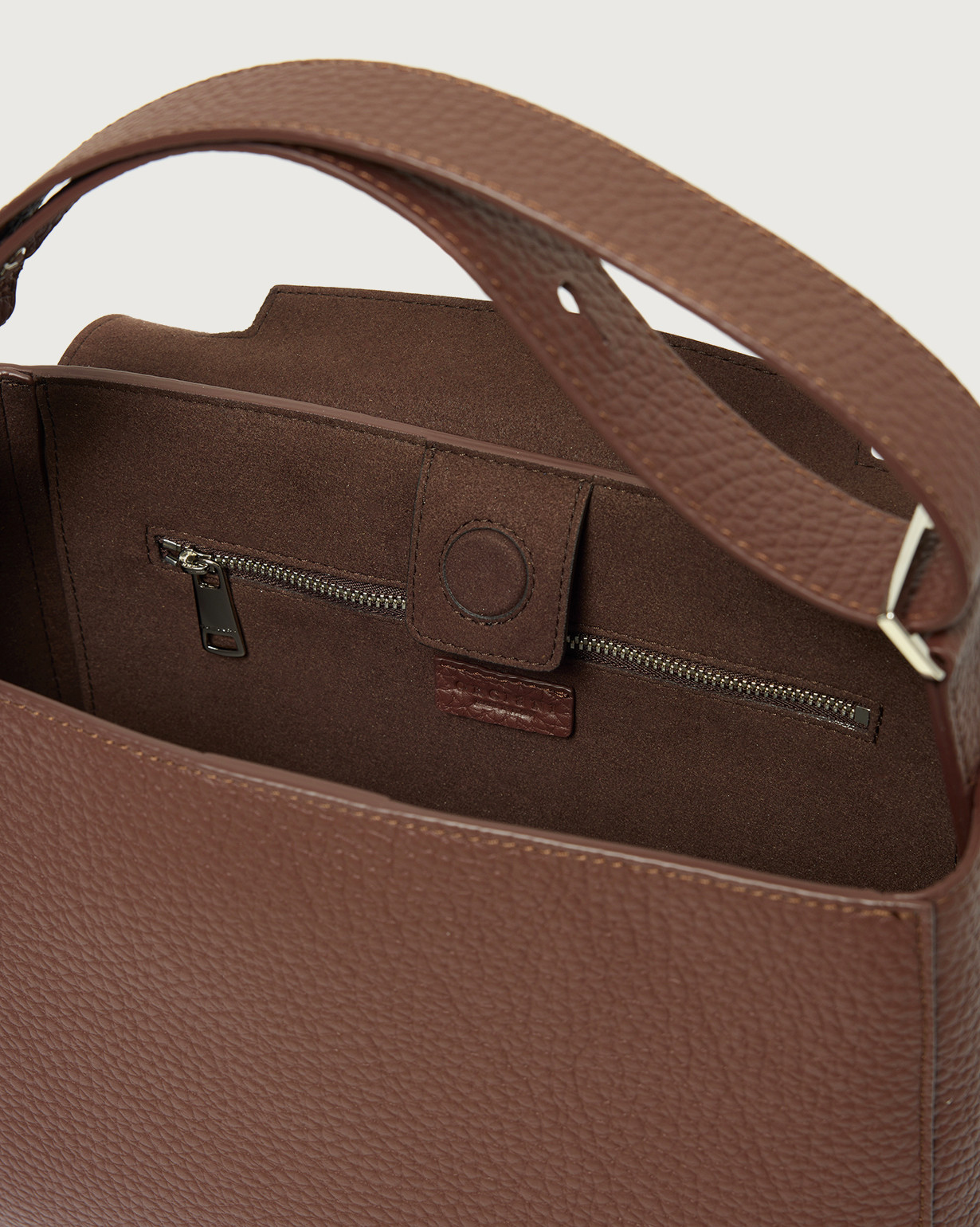 La morbida pelle martellata e l'apertura a scomparsa consentono di accedere comodamente all'interno della borsa senza sollevare la patta. La tasca interna con zip è personalizzabile in oro o argento con un massimo di 3 iniziali, per renderla un accessorio unico e prezioso.