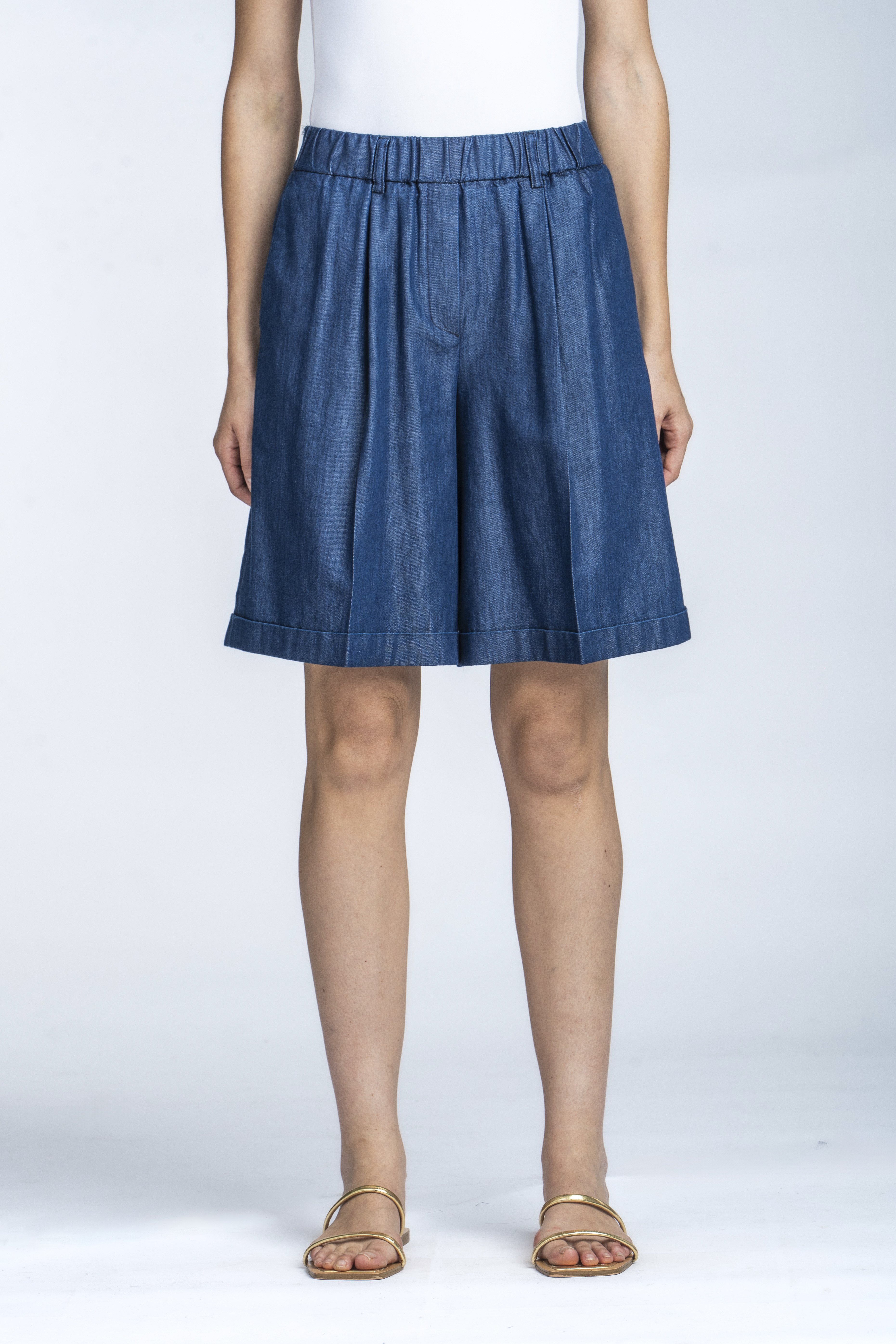 Bermuda in jeans leggero con vita elasticizzata e passanti per cintura. Pieghe frontali e gamba ampia con lunghezza al ginocchio.
