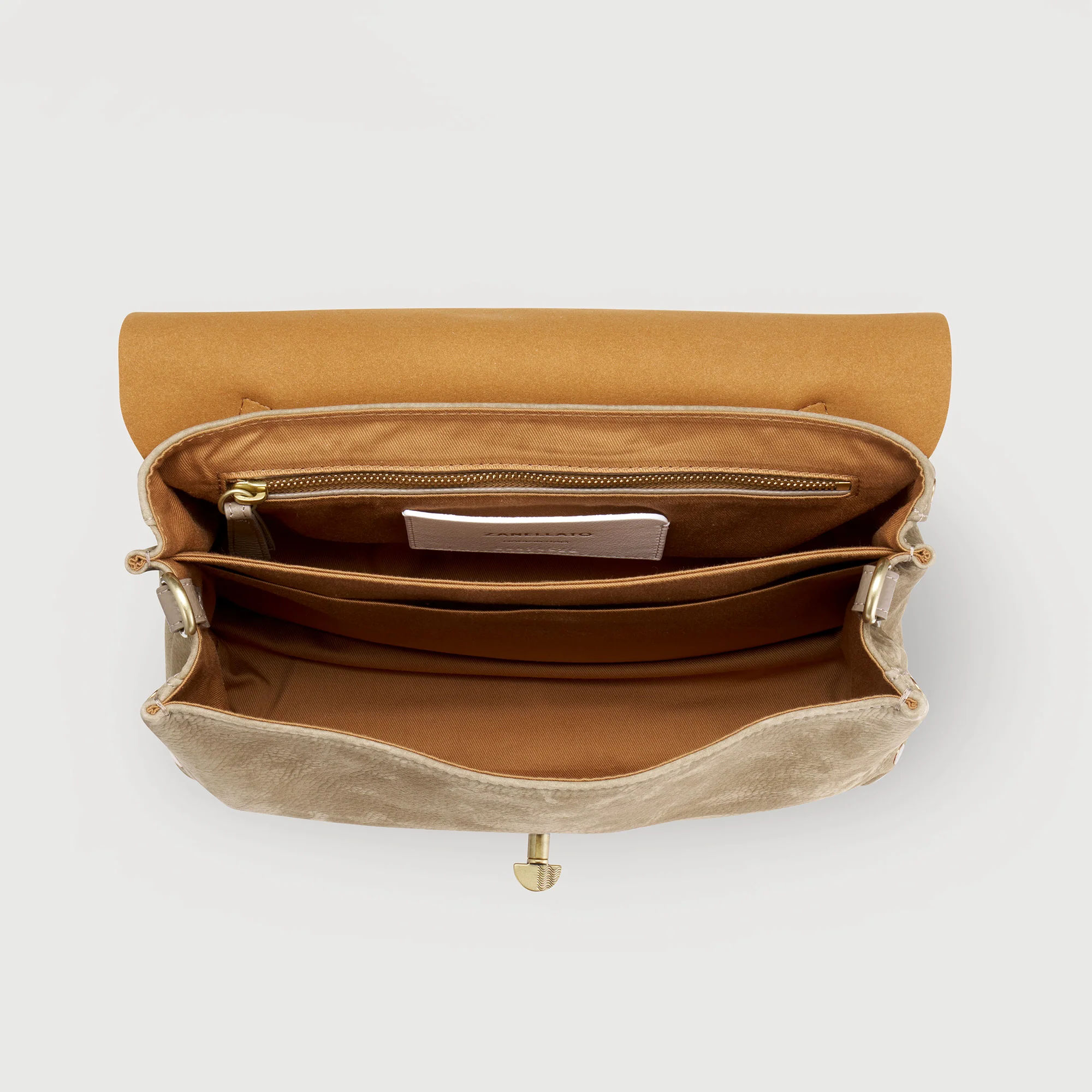Il lusso contemporaneo si esprime al meglio in questa borsetta Postina®. Lavorato in pelle nabuk dalla texture supersoft, granulosa e morbida, questo piccolo capolavoro artigianale presenta una silhouette essenziale impreziosita dai riflessi della doppia chiusura a girello e delle borchie laterali. Lo spazio interno è sfoderato, dotato di una tasca dove riporre comodamente i tuoi effetti personali. La tracolla in pelle regolabile aggiunge un tocco di versatilità a questa borsa piccola firmata Zanellato.